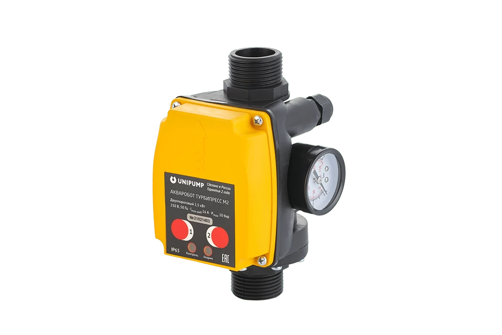 Блок автоматического управления насосом АКВАРОБОТ ТУРБИПРЕСС М2 предназначен для автоматического управления однофазными насосами мощностью до 1,5 кВт по потоку жидкости и по давлению в системе.