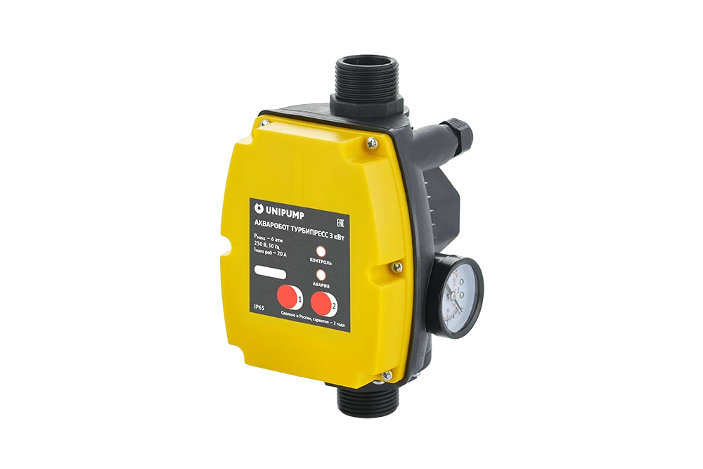 Блок управления насосом АКВАРОБОТ ТУРБИПРЕСС 1,5 предназначен для автоматического управления однофазными поверхностными и погружными насосами мощностью до 1,5 кВт Он автоматически включает и выключает насос в зависимости от потока жидкости и минимального давления (Pмин) в системе.Основные функции блока ТУРБИПРЕСС 1,5: